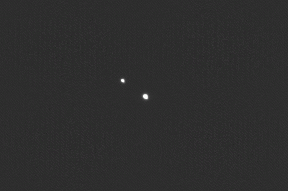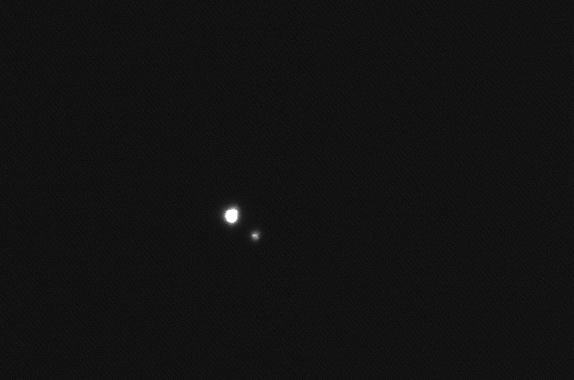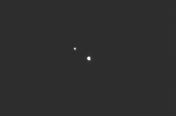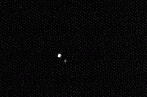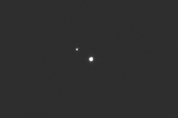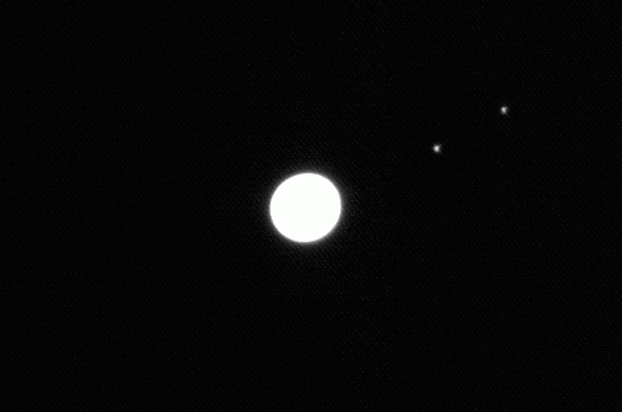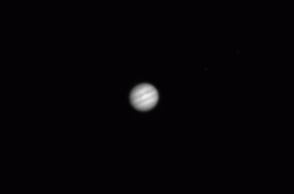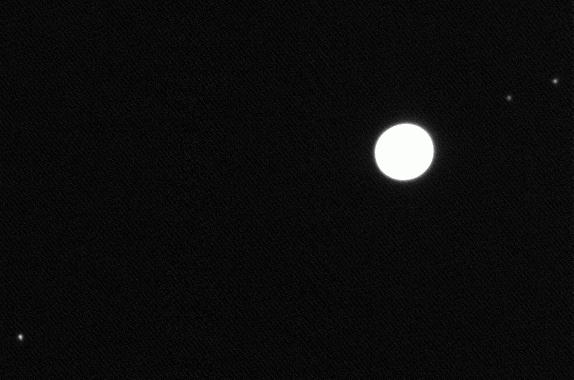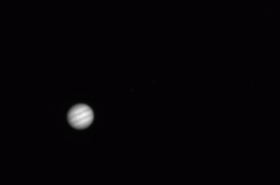5.06.2004, 20:06:51 UT, Texp = 1 s, Filtr: wąski H-alfaJowisz, Io, Europa i Ganimedes